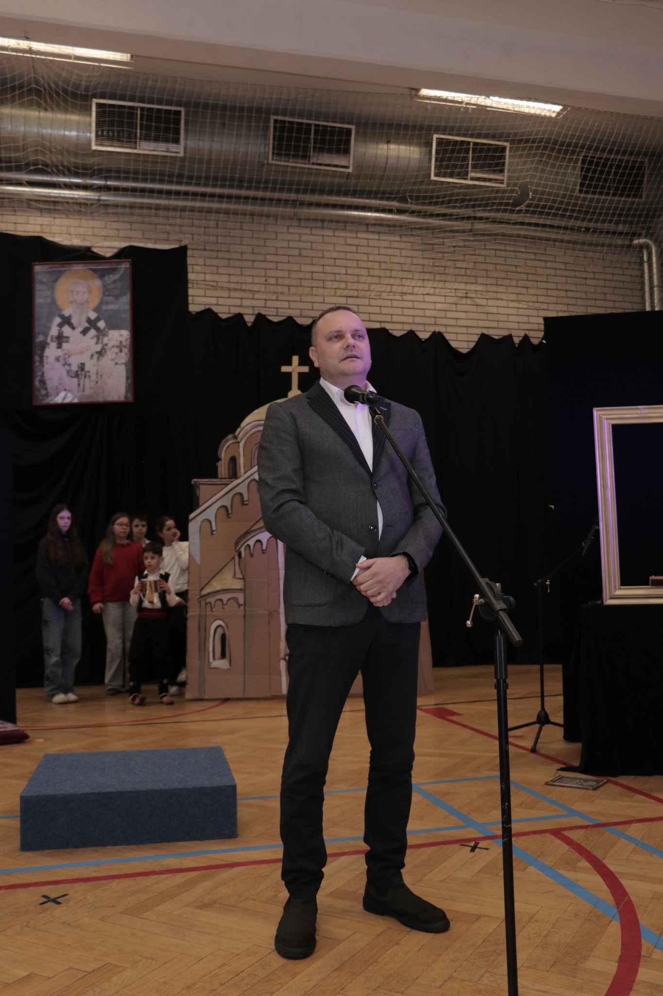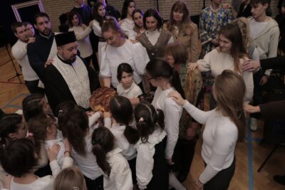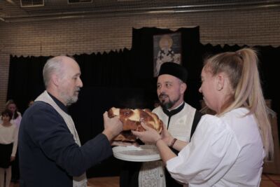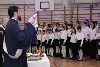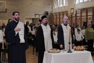 Потом су о. Зоран Остојић, парох будимештански, о. Зоран Живић, парох калашки, вероучитељ у Српској основној школи и гимназији „Никола Тесла” у Будимпешти, уз саслужење ђакона Стефана Милисавића, осветили кољиво и пререзали славски колач. Свечану беседу за основце одржао је о. Зоран Живић, а за гимназијалце о. Зоран Остојић. Ово приликом у свом кратком обраћању отац Зоран Остојић је посебно нагласио важност духовне и историјске улоге Светог Саве. Он је рекао да је Свети Сава усавршио хришћанство код Срба које данас називамо Светосављем. Иако није много писао, ипак Свети Сава је био перо Светог Духа. „Ми када се молимо или певамо сви ми пишемо ту велику књигу о Светом Сави. Сви ми треба да се угледамо на Светог Саву” – истакао је у својој проповеди будимпештански парох.
